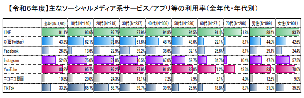 出典:総務省「【令和6年度】主なソーシャルメディア系サービス/アプリ等の利用率(全年代・年代別)