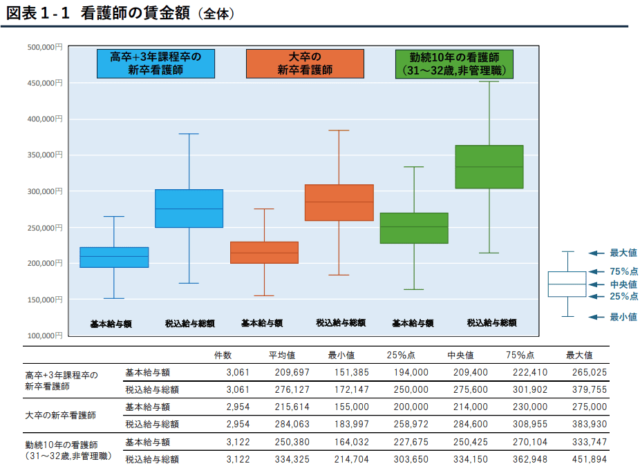 日本看護協会の調査によると、勤続10年の看護師(31〜32歳・非管理職)の税込給与総額は平均33.4万円です。