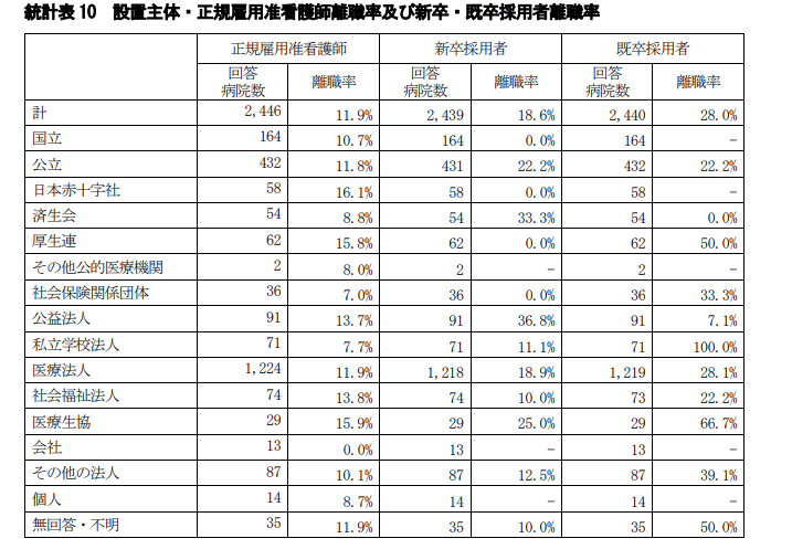 出典:日本看護協会「設置主体・正規雇用准看護師離職率及び新卒・既卒採用者離職率」